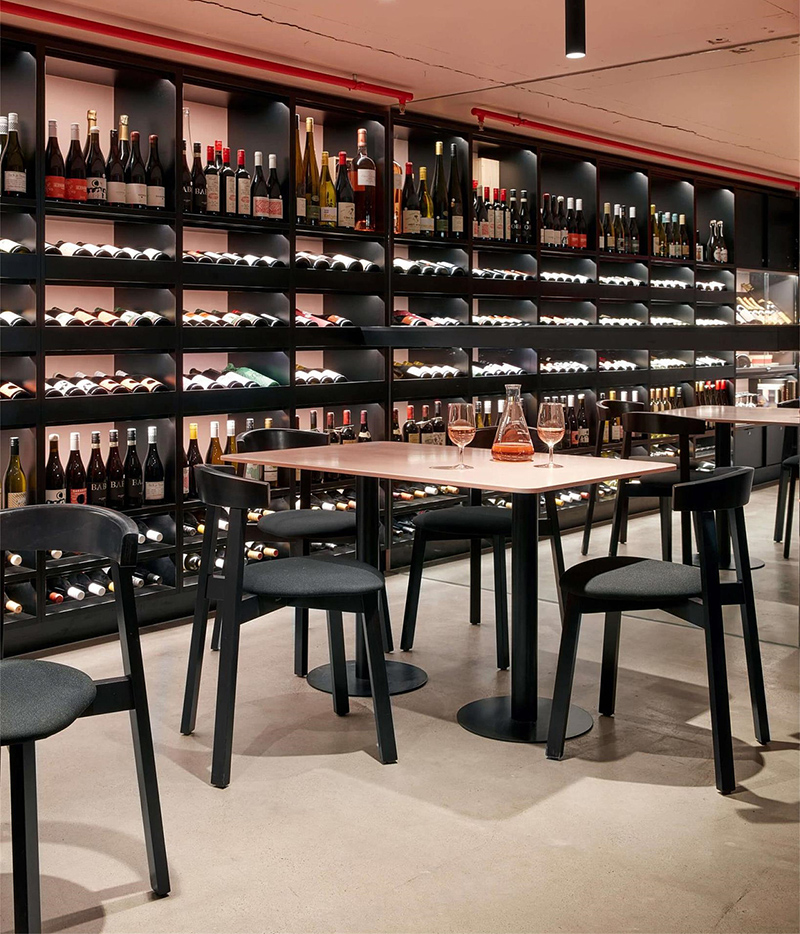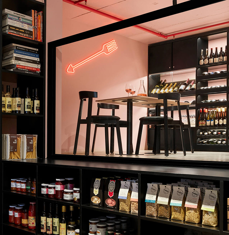 在柜臺(tái)旁邊安裝了一個(gè)大瓷磚的廚師工作臺(tái),這是一個(gè)鼓勵(lì)顧客坐下來(lái)了解各種食物的地方。此外,位于夾層的品酒室允許顧客從熟食店品嘗各種葡萄酒和產(chǎn)品,并俯瞰一樓。