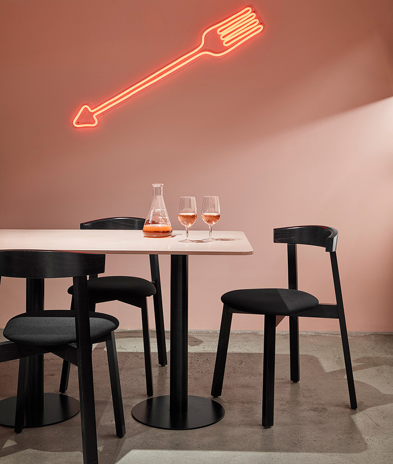 熟食區(qū)的柜臺(tái)由模制混凝土制成,表面紋理讓人想起卡門(mén)伯特奶酪。地面平整,墻面鋪著干凈的白色瓷磚,瓷磚表面是粘土。周?chē)膲Ρ诒黄岢煞奂t色,與出售的熟香腸和軟熏牛肉的顏色相匹配。