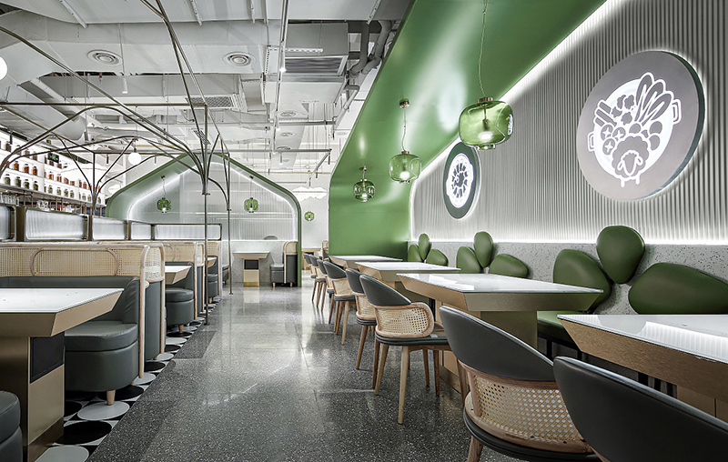 本案以擁抱自然、奔向遠(yuǎn)方為出發(fā)點(diǎn),變形組合出全新圖案應(yīng)用在空間,由外至內(nèi),層層深進(jìn),連通互襯,打造出一個(gè)特色鮮明、簡(jiǎn)約時(shí)尚的餐廳。