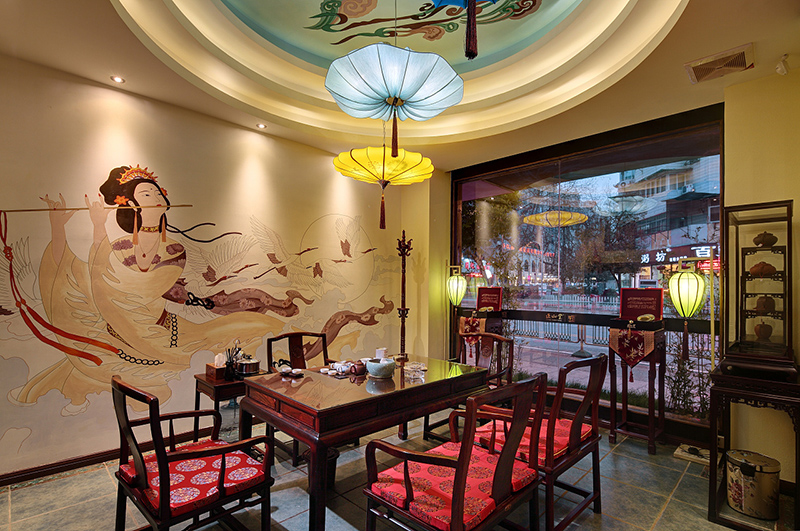 古樸的木質(zhì)板凳作為一種裝飾,中式元素的月亮門作為展示柜的外框,既不失中式文化的韻味,也增添墻面的靈動(dòng)性,還有那最最引人注目的彩繪,天外飛仙的的頂面,使整個(gè)空間仙境一般。包間內(nèi)古樸的老紅木,古老的字畫,帶著神秘的色彩,營造古樸高雅的空間氣氛,盡顯濃厚的茶文化。木質(zhì)的深色則讓空間更加含蓄、神秘,從而突出亮點(diǎn),增強(qiáng)空間的藝術(shù)感染力,營造一種靈氣和貴氣。