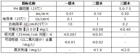 注2:由于一級(jí)水的純度下,難于測(cè)定可氧化物質(zhì)和蒸發(fā)殘?jiān)瑢?duì)其限量不做規(guī)定,可用其他條件和制備方法來(lái)保證一級(jí)水的質(zhì)量。