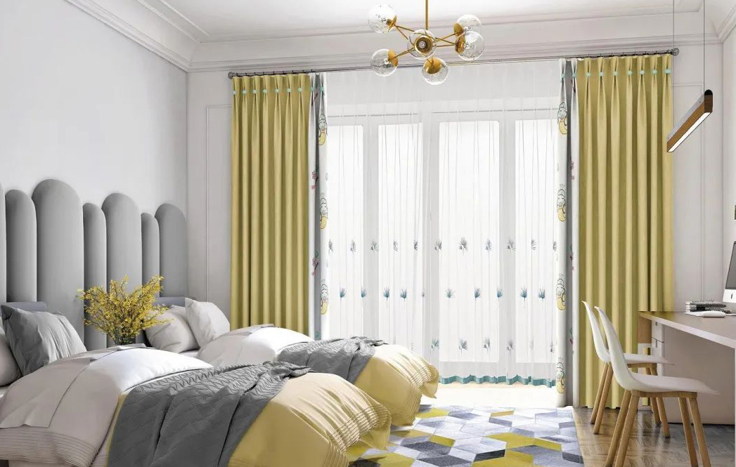 在選購時(shí),不僅要遮陽,還需美觀,朝南臥室,除了遮陽簾,加層半透明紗簾,白天拉上紗簾,既防曬,還有朦朧美。