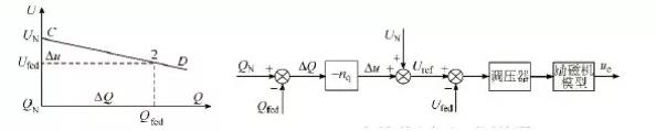 同理,CD段的斜率稱為同步發(fā)電機(jī)的無功-電壓下垂控制系數(shù)nq,反應(yīng)了發(fā)電機(jī)組無功功率增量與端電壓偏差的關(guān)系,且ΔU=Uref-UN,ΔQ=QN-Qred。由同步發(fā)電機(jī)勵磁功率單元控制框圖可知,經(jīng)過測量環(huán)節(jié)與調(diào)差環(huán)節(jié)的計算得出參考電壓,然后在與發(fā)電機(jī)端電壓進(jìn)行比較(其中調(diào)壓器為PI控制),使得發(fā)電機(jī)端電壓始終迅速跟蹤電壓指令。