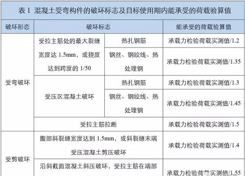 當(dāng)在規(guī)定的荷載持續(xù)時(shí)間內(nèi),出現(xiàn)表1中的破壞標(biāo)志之一時(shí),說(shuō)明構(gòu)件在目標(biāo)試用期內(nèi)的荷載作用下,不能滿足承載力要求,應(yīng)取本級(jí)荷載值與前一級(jí)荷載值得平均值作為其承載力檢驗(yàn)荷載的實(shí)測(cè)值,并根據(jù)表1中建議的方法推算構(gòu)件在目標(biāo)使用期內(nèi)能夠承受的荷載驗(yàn)算值。