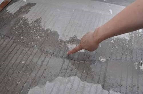 近日,常州的胡女士在九龍倉年華里購買了一個(gè)新房在交付期間,業(yè)主通過驗(yàn)房委托中心為其進(jìn)行房屋驗(yàn)收。在驗(yàn)收過程中,發(fā)現(xiàn)其中一戶的客廳地面有一條約4米長的南北向裂縫,臥室地面有一條約為3米的南北向裂縫,疑似為貫穿性開裂,經(jīng)過澆水試驗(yàn),發(fā)現(xiàn)裂縫的裂紋較為明顯,下層頂面裂縫位置燈頭處出現(xiàn)明顯水印且伴有滴水現(xiàn)象,可初步確認(rèn)裂縫貫穿樓板,當(dāng)把地面找平層鏟除后發(fā)現(xiàn)地面現(xiàn)澆板相同位置也有同樣的裂縫。