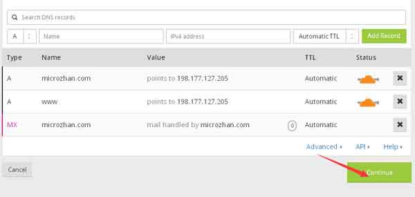 3, cloudflare掃描網(wǎng)站后或自動(dòng)掃描出dns解析條目,可以再額外增加和刪除解析。嫌麻煩的就直接點(diǎn)擊"continue"