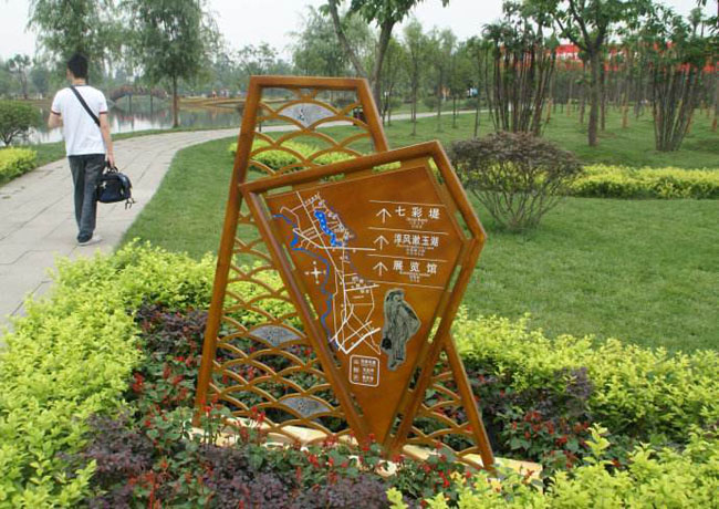 這時(shí)設(shè)計(jì)師就要考慮標(biāo)識(shí)的存命,臨時(shí)性標(biāo)識(shí)由于使用時(shí)間短,普通材料基本都能滿足,只要充分考慮視覺(jué)效果和使用成本就可以;長(zhǎng)期性標(biāo)識(shí)在選材時(shí)就要注意材料使用的壽命,選材不當(dāng)不僅會(huì)對(duì)景區(qū)造成損失,也給以后的維修帶來(lái)麻煩。