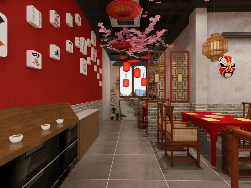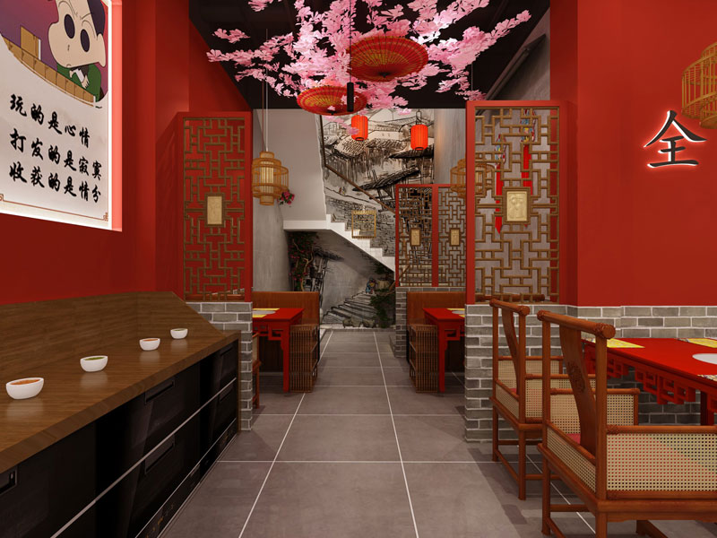 中國(guó)風(fēng)火鍋店設(shè)計(jì)以中國(guó)紅作為主色調(diào),仿古地磚作做為地面主要裝修材料,油紙傘與竹制品作為裝飾,打造復(fù)古中國(guó)風(fēng)。