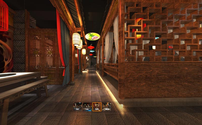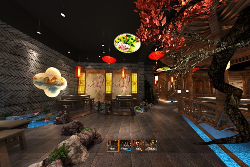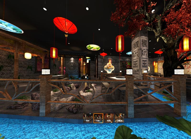 火鍋店設(shè)計(jì)師在空間中采用青磚、紅樹、荷花、紅傘等元素作為我們空間燈具和裝飾品,再輔以一些具有中式特色的圖案造型,打造出一個(gè)古風(fēng)、質(zhì)樸的火鍋店就餐空間。