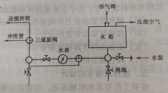 圖中所示正是這種供水系統(tǒng)的原理,它由密封壓力水箱、閘閥、水表(量水器)和三通閥等組成。壓力水箱下部接出水管,并通過閥門分別與水源或工作部分相通。水箱蓋上裝有排氣閥和安全閥,以備進水排氣和超壓保護時起作用。另外還接有壓縮空氣進氣管,壓縮空氣引自汽車的儲氣罐,經(jīng)減壓閥和控制閥供水箱排水。工作前先向水箱加滿用水,工作時與水箱接通壓縮空氣,按需要調(diào)整三通閥,水既沿管路和閥門被送到?jīng)_洗管或攪拌筒中。