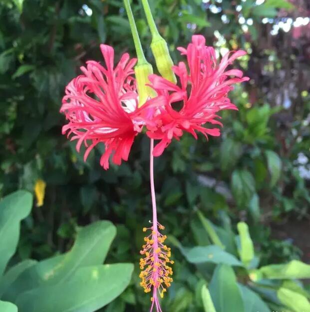 還有一種扶桑是吊燈籠式,也叫吊燈扶桑,花瓣像碎裂的花邊,向上翻起,而花蕊就細(xì)長的垂吊,非常細(xì)致。