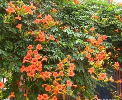 凌霄為常見藤本植物,綠葉蔥蔥,花開之時,橘紅色的花朵點綴于綠葉之間,光輝燦爛,生氣勃勃。