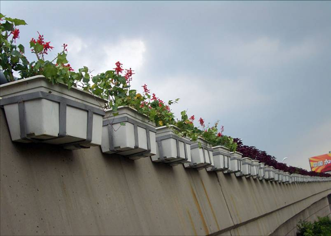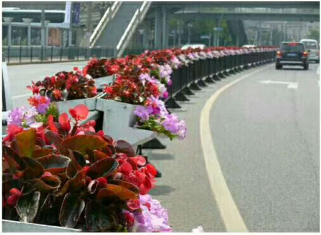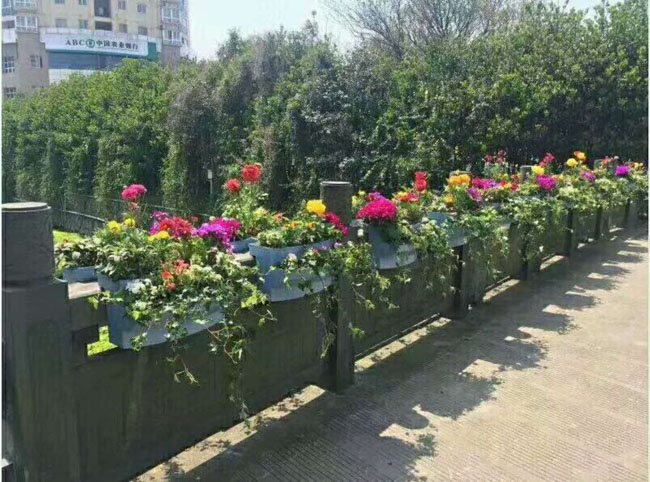 1、確定綠化載體的寬度(如:護(hù)欄的上邊寬或圓形護(hù)欄的直徑),如果使用2個(gè)鞍式花盆騎在載體上,可以采用符合載體寬度的螺桿鏈接加鐵絲加固,高度非常高的載體須用鋼結(jié)構(gòu)托架。