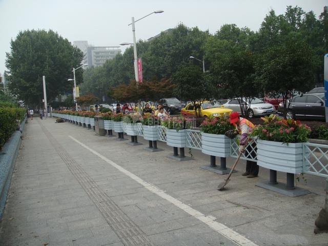 人行道與機(jī)動(dòng)車道隔離,防止行人跨越,保障了行人的安全,南京采取了護(hù)欄的隔離,與弧形桶花箱相搭配,相得益彰,最大的亮點(diǎn)還是花箱中的植物,植物的搭配需要符合當(dāng)?shù)氐乩砦恢谩夂驐l件,與街道景觀,人文因素匹配,那么常春藤、變?nèi)~木在此處就發(fā)揮了自己的價(jià)值!
