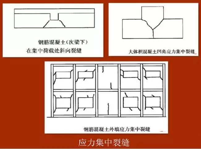 裂縫一般特征:應(yīng)力集中裂縫一般發(fā)生在門(mén)窗洞口的角部和平立面突出凹進(jìn)的轉(zhuǎn)角處,且斜向楔形狀裂縫居多。在集中荷載較大的部位,易產(chǎn)生劈裂狀的裂縫。在預(yù)應(yīng)力結(jié)構(gòu)錨固端的局部承壓處,有時(shí)出現(xiàn)一條或數(shù)條裂縫,并呈放射形狀。