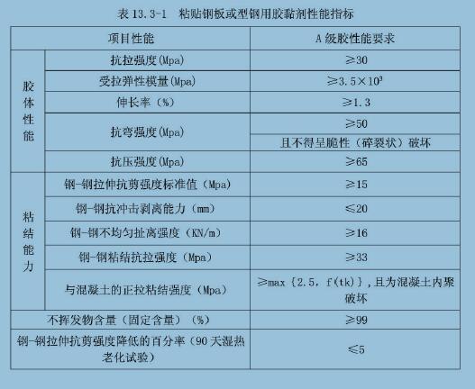 (1)粘貼鋼或外粘型鋼的膠黏劑必須采用專門配制的改性環(huán)氧樹脂膠黏劑,其性能檢驗(yàn)指標(biāo)必須符合表13.3-1的規(guī)定。