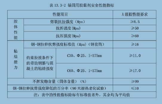 (2)橋梁結(jié)構(gòu)錨固用的膠黏劑,必須規(guī)定采用專門配制的改性環(huán)氧樹脂或該性乙烯基酯類膠黏劑(包括改性氨基甲酸酯膠黏劑),起安全性檢驗(yàn)指標(biāo)必須符合表13.3-2的規(guī)定。