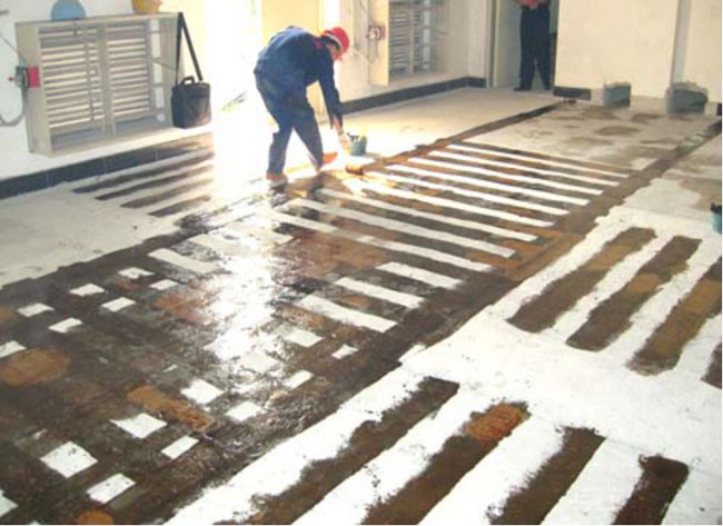 (4) 涂刷底膠:應按照所選粘結劑供應商的產品說明書配制底膠。涂刷底膠前應用丙酮擦凈混凝土的表面。底膠應用滾筒刷或特制的毛刷均勻涂布于混凝土表面,調好的底膠應在規(guī)定的時間內用完。