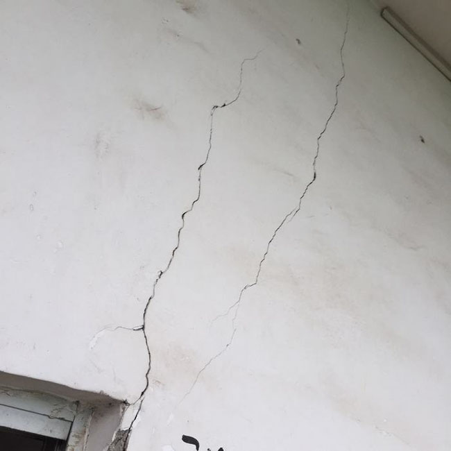 房屋沉降不均勻造成墻面斜向開裂,表現(xiàn)在屋角天花板或樓梯間等處多條裂縫;