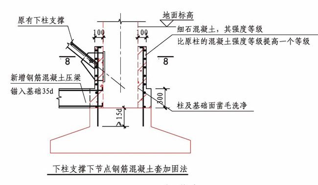 既有房屋地基基礎(chǔ)因支承力不足而產(chǎn)生病害時通常采用混凝土套加固法。采用此法加固時基礎(chǔ)每邊均擴(kuò)寬20cm,且需加設(shè)的鋼筋應(yīng)與原基礎(chǔ)主筋焊接。
