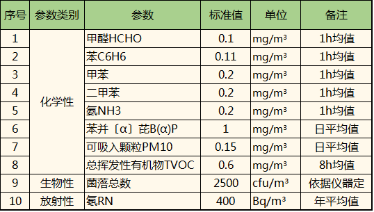 內(nèi)容介紹: 2010年國家頒布的室內(nèi)空氣質(zhì)量檢測標準全部參數(shù)為(見下圖)