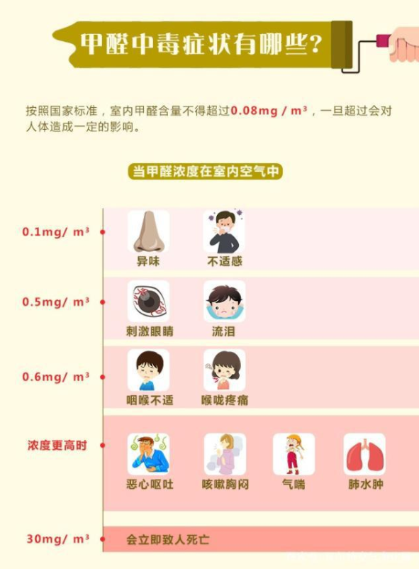 當(dāng)甲醛濃度在每立方米空氣中達(dá)到0.06-0.07mg/m3時(shí),兒童就會(huì)發(fā)生輕微氣喘;當(dāng)室內(nèi)空氣中甲醛達(dá)到0.1mg/m3時(shí),就有異味和不適感;甲醛達(dá)到0.5mg/m3時(shí),可刺激眼睛,引起流淚;甲醛達(dá)到0.6mg/m3,可引起咽喉不適或疼痛。濃度更高時(shí),可引起惡心嘔吐,咳嗽胸悶,氣喘甚至肺水腫;甲醛達(dá)到30mg/m3時(shí),會(huì)立即致人死亡。