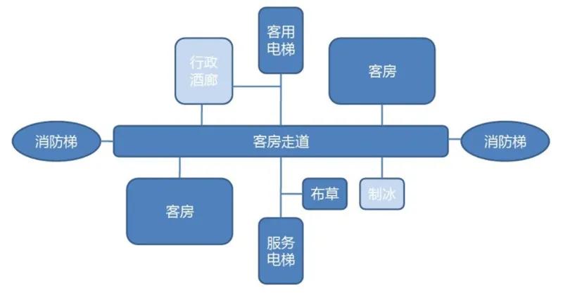 后臺(tái)部分主要分為酒店管理人員及餐飲服務(wù)人員,清潔服務(wù)人員。在管理區(qū)員工應(yīng)使用員工工作電梯,辦公商務(wù)中心應(yīng)設(shè)置在在各個(gè)功能區(qū)域滿足酒店管理服務(wù)要求,酒店管理辦公區(qū)域應(yīng)該設(shè)置獨(dú)立空間。餐飲區(qū)域,應(yīng)設(shè)計(jì)廚房食梯,運(yùn)送餐品至各個(gè)樓層更加便捷。餐飲區(qū)域的服務(wù)人員應(yīng)通過獨(dú)立的內(nèi)部員工工作電梯進(jìn)行餐飲服務(wù),進(jìn)入各個(gè)餐飲空間也應(yīng)通過內(nèi)部工作走廊,盡量避免顧客和服務(wù)人員通道共用,流線交錯(cuò)的問題。在包廂處設(shè)置備餐間,確保菜品送達(dá)后安排統(tǒng)一送菜服務(wù)。清潔服務(wù)人員也應(yīng)通過內(nèi)部員工電梯和客房各層的清潔服務(wù)間對(duì)每層的房間進(jìn)行衛(wèi)生清潔服務(wù)。由于客房區(qū)域的特殊性,對(duì)客房進(jìn)行打掃應(yīng)采取錯(cuò)峰時(shí)間,避免與入住旅客流線交錯(cuò)。