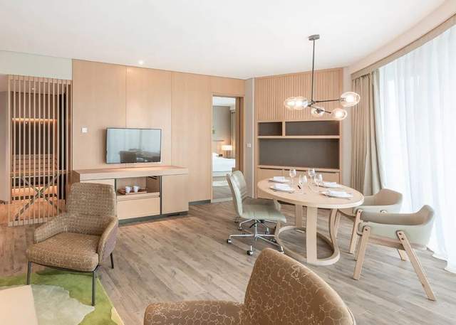 首層大堂以克制簡練的設(shè)計語言營造出簡約舒適的空間,讓旅途的奔波消解在踏入酒店的剎那。波浪式弧形吊頂、砂巖肌理墻壁及魚尾造型雕塑,于無聲中開啟旅客與三亞的故事。
