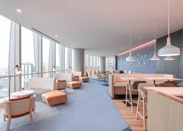 整體造型設(shè)計將動感的“波浪”引入靜止的空間,在同樣充滿變化的異形建筑體內(nèi)延續(xù)并展開海洋絮語,喚醒商旅時間的奇妙遐想。活潑鮮艷的海洋裝飾畫打破了空間的寧靜,碰撞帶來的視覺美感豐富了空間的層次。