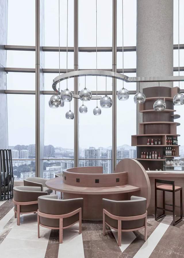 開放式的社交體驗,自然光無阻礙的滲透,營造出如家般的自在氛圍。光面、磨砂、充滿肌理感的大理石及各式地毯,以同樣的線性設(shè)計語言呈放射狀鋪設(shè),呼應(yīng)建筑的弧形設(shè)計。