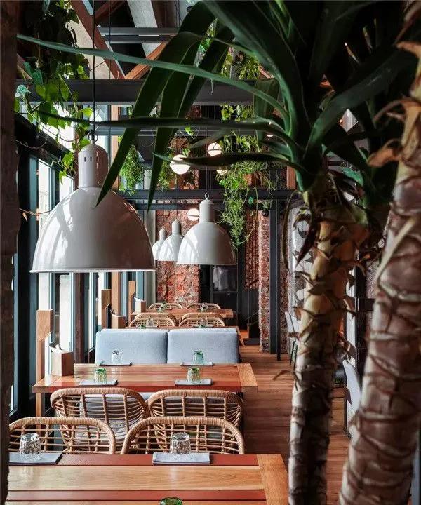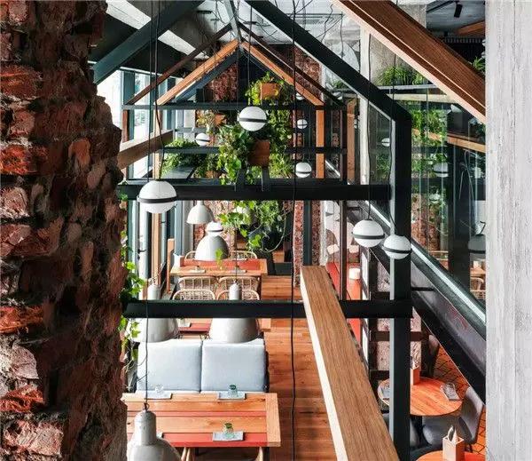 ·建筑為餐廳兩層之間提供了連接。這一部分是與某種冬季花園:有很多光線和綠色植物,這一區(qū)域所有的家具都是戶外類型,燈也類似于街頭聚光燈。