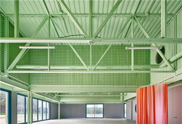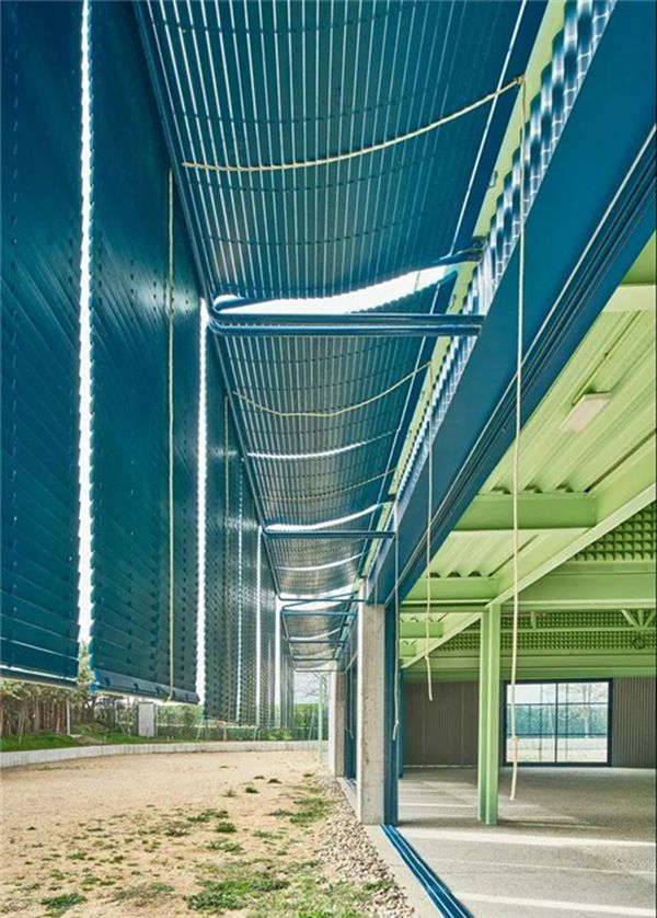 基地的建設(shè)以鋼架構(gòu)為主,因地制宜的構(gòu)筑物邊緣圓孔設(shè)計(jì)為麻雀提供了天然的筑巢區(qū),成為這個(gè)在地自調(diào)節(jié)生態(tài)系統(tǒng)中的即興元素。小鳥和棲息在南立面的蝙蝠以昆蟲為食,包括某些攜帶犬類疾病的蚊子等,其同時(shí)還是周邊田地花卉和植物授粉周期的重要組成部分。
