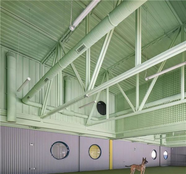基地的視線高度和室內(nèi)空間的開口高度都進(jìn)行了調(diào)整,以方便管理。百葉窗對(duì)建筑的南立面進(jìn)行了遮蔽,并在下方留出足夠的空間以供犬類到室外活動(dòng)。屋頂?shù)拇笥晁占劭蓾M足犬類和鳥類的飲水所需,室內(nèi)表面覆蓋的吸音金字塔型泡沫絕緣材料能以最大的限度減少回聲、噪音與混響。