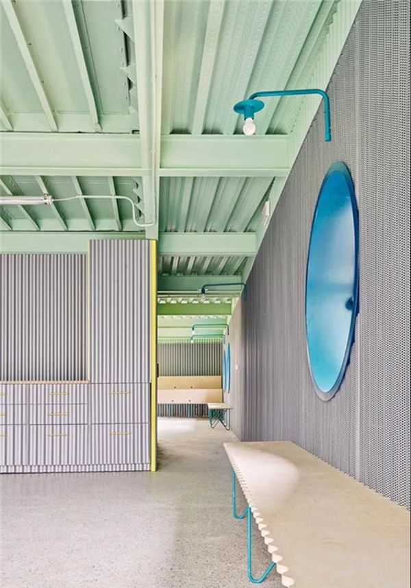 該項(xiàng)目使用了多種材料品項(xiàng),并將不同的建造技術(shù)、交流方式與生產(chǎn)系統(tǒng)結(jié)合在一起:通過運(yùn)輸集裝箱的再利用實(shí)現(xiàn)材料生態(tài)和廢物減少的目標(biāo);借助現(xiàn)澆混凝土及其表面的光滑度提供必要的適應(yīng)性和熱質(zhì)量;使用邊角料中回收的板材制作新型桁架所需的起伏模板等。