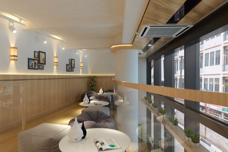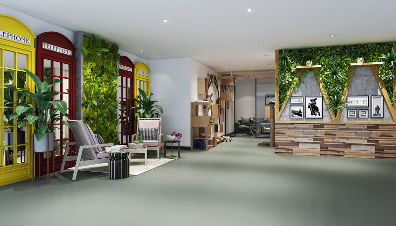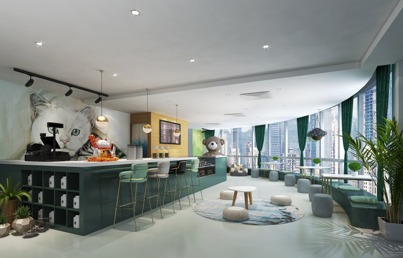 ?紋理清晰的木質(zhì)地板與原木質(zhì)桌椅搭配自然,堆滿書籍、雜志的書架把故事悄悄隱藏,安靜陳列的貓式造型微笑著向你招手。