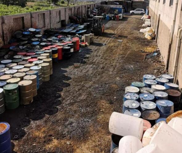 據(jù)統(tǒng)計,該廢桶處置場所內(nèi)有未處理的廢桶百余只,已處理完成的鐵皮 10 捆,廢桶加工產(chǎn)生的大量鐵桶蓋,塑料桶 41 只,半噸桶的殘液殘渣,總重近 30 噸。