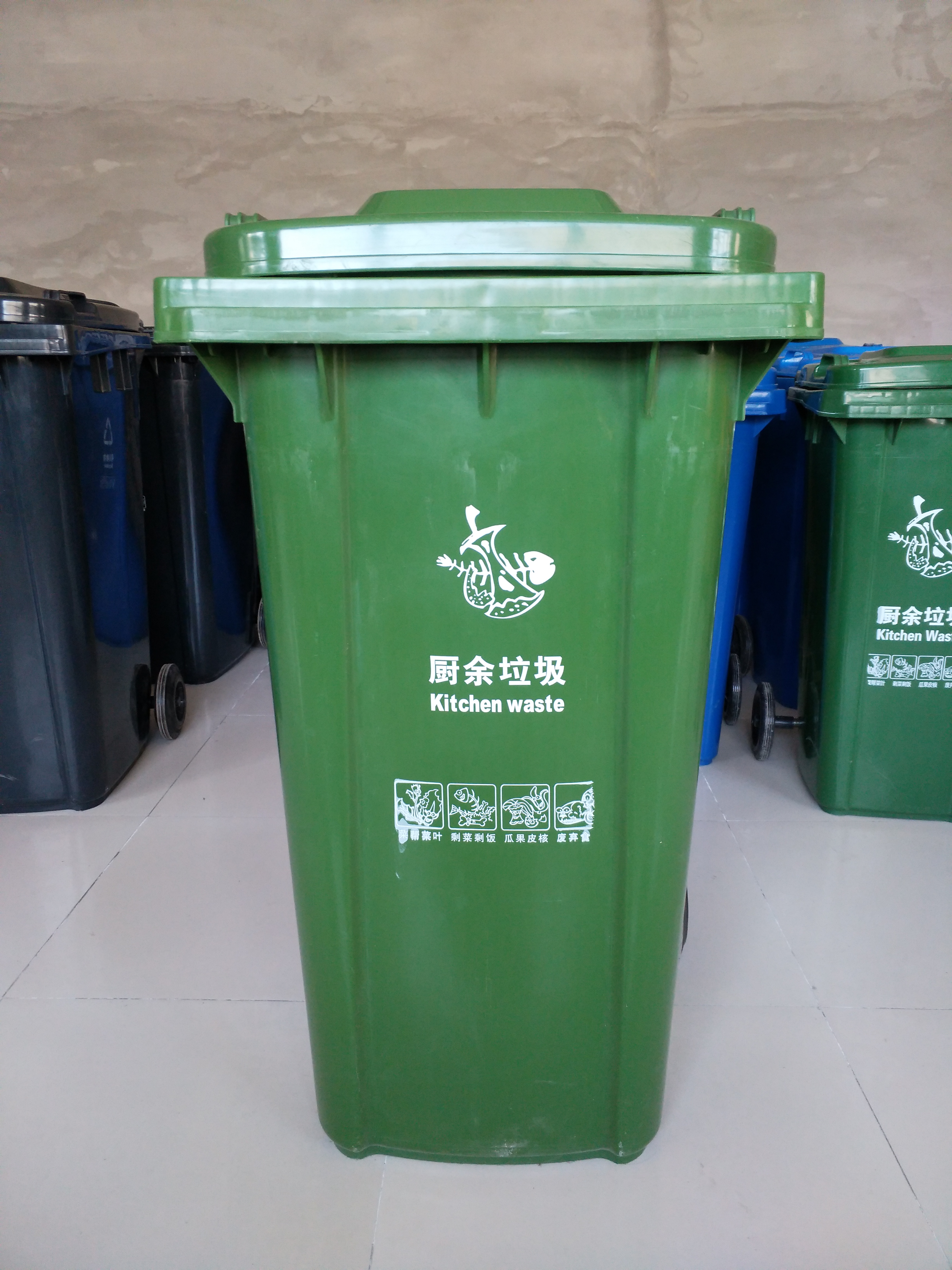 2.餐廚垃圾桶通常為綠色或者軍綠色,配有專用餐廚垃圾標(biāo)識,容易辨識;