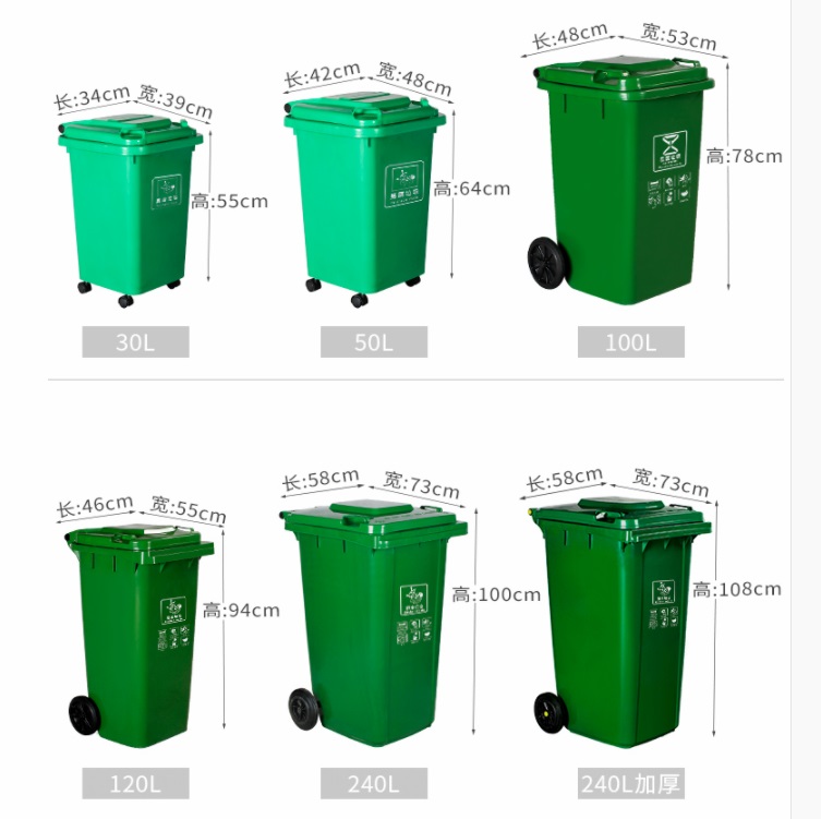 目前四川環(huán)衛(wèi)塑料垃圾桶常用規(guī)格一般有:20升、30升、50升、100升、120升、240升、660升等常