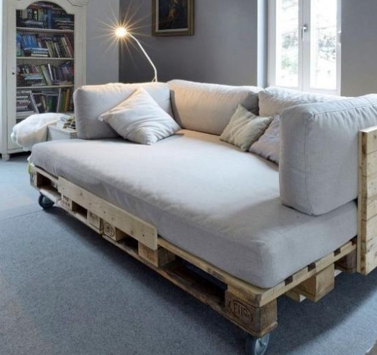 當(dāng)然,我們也可以用貨運(yùn)托盤來制作一個(gè)可移動(dòng)的沙發(fā)或者是沙發(fā)床。如何做到可移動(dòng)?只要在托盤底部安裝輪胎即可,這樣就可以讓沙發(fā)移動(dòng)到你想去的所有地方。