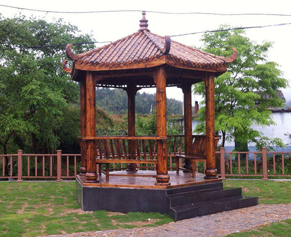 木構(gòu)的涼亭,以木構(gòu)架琉璃瓦頂和木構(gòu)黛瓦頂兩種形式最為常見。前者為皇家建筑和壇廟宗教建筑中所特有,富麗堂皇,色彩濃艷。而后者則是中國古典亭榭的主導(dǎo),或質(zhì)樸莊重,或典雅清逸,遍及大江南北,是中國古典涼亭的代表形式。此外,木結(jié)構(gòu)的涼亭,也有做成片石頂、鐵皮頂和灰土頂?shù)模贿^一般比較少見,屬于較為特殊的形制。