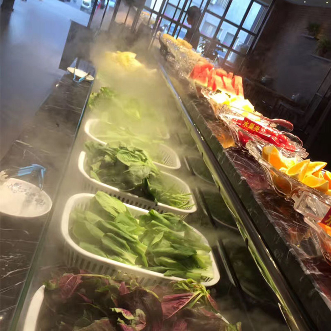 冷霧加濕器可以讓水珠附著在蔬菜表面,讓蔬菜的色澤看起來更加翠綠透亮,一看就很有食欲,同時也可以避免了蔬菜水分和重量的流失,更重要的是噴霧加濕器云霧飄渺的視覺效果可以吸引顧客購買欲望、增大火鍋店的銷售利潤,有如此“神器”助攻,火鍋店人氣增加不是理所當然的嗎?