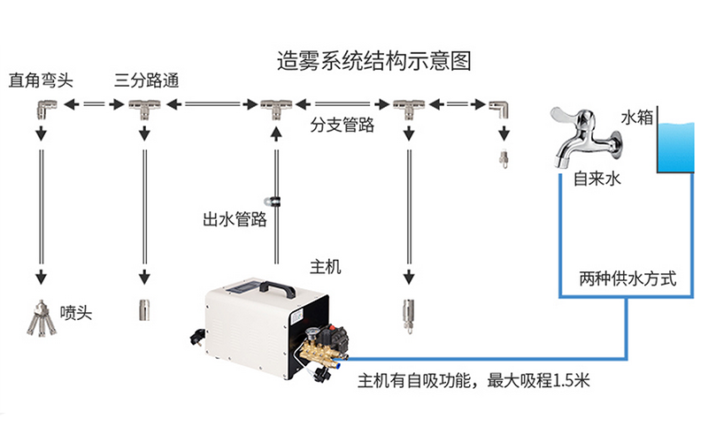 霧噴霧咀每秒能生50億個霧滴,霧滴的直徑僅為0.5-15um,尤如山中云霧,在空氣中迅速蒸發(fā) 形成水蒸汽。