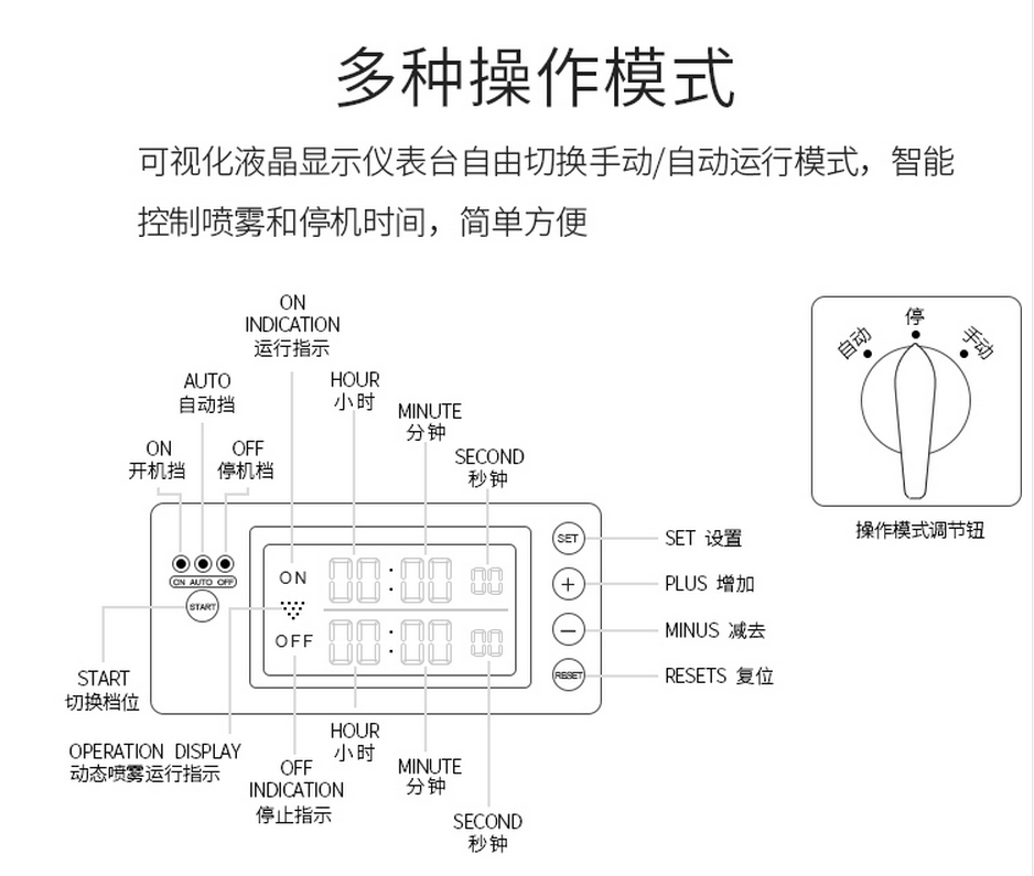 2.控制單元系統(tǒng)根據(jù)工程需要,可采用時(shí)間控制.濕度控制,時(shí)間控制可按照時(shí)間分段或循環(huán)控制噴霧時(shí)間段可按照小時(shí),分鐘,或以秒為單位,也可實(shí)現(xiàn)無人路燈能理系統(tǒng)方式運(yùn)行自動(dòng)開啟或自動(dòng)停止。當(dāng)控制單元外接濕度傳感器或溫度傳感器以及外部控制器的伺服機(jī)構(gòu)時(shí),即可構(gòu)成全自動(dòng)系統(tǒng)。