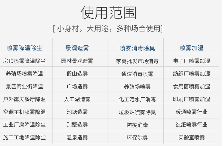 2.高效:微霧顆粒,能快速地大范圍擴(kuò)散在周圍空氣中,形成氣霧環(huán)境。