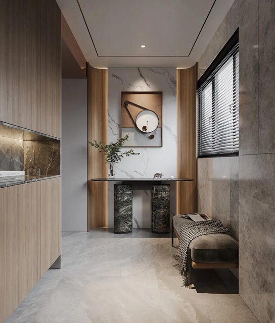 一個舒適的玄關(guān)應(yīng)該是布置合理,少不了穿衣鏡和隨手放置物品的臺面,門廳考慮了業(yè)主喜歡的原木色系,加以奶茶色進(jìn)行輔助,一株綠植一幅畫,柔和了灰色的沉穩(wěn),時尚腔調(diào)撲面而來。樣板間軟硬設(shè)計