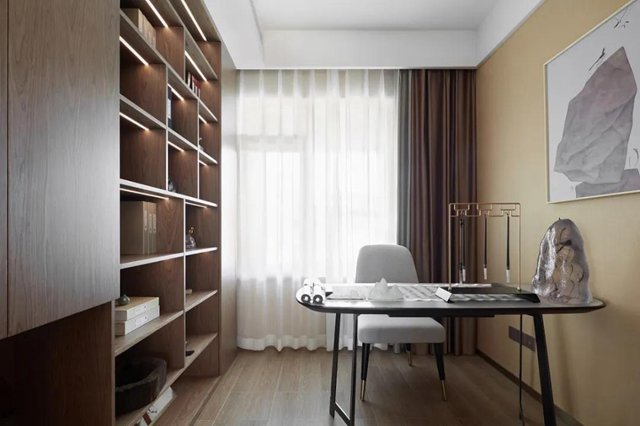 書房,采用黑色圓弧形的書桌,美觀且不會變形。整面墻的柜子和開放格極大滿足收納展示需求。