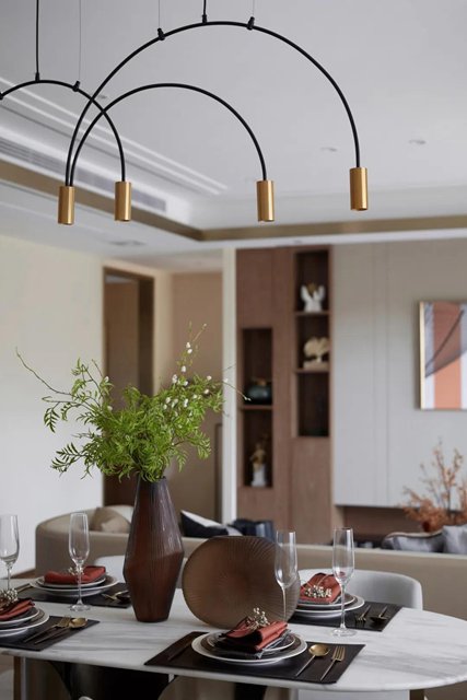 餐廳點綴不同層次的色調。藝術感的吊燈延續(xù)客廳浪漫氣氛,弧形的大理石餐桌搭配綠植為餐廳增加一份簡潔清爽。