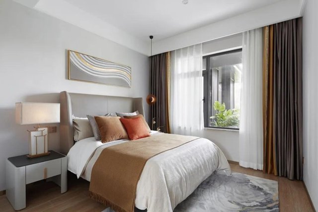 主臥與客廳色調成一體,床頭墻面采用軟包,擺上橙色系的皮質床,還有對稱的床頭燈布置,讓空間的氣質感自然流露。