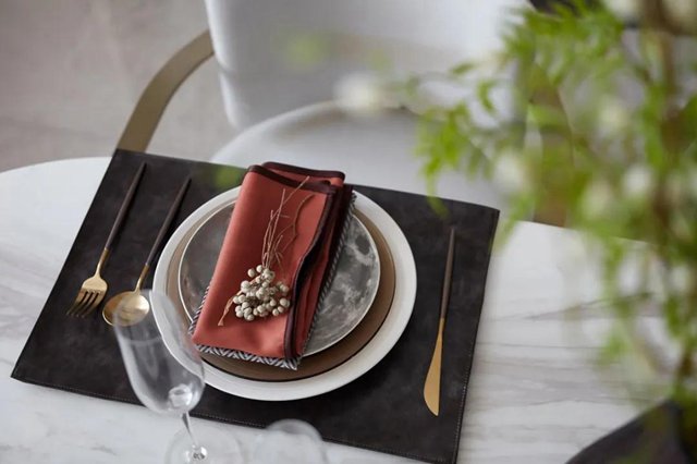 餐廳與客廳以橫廳的格局,擺上大理石臺面的餐桌,搭配金屬邊的皮質餐椅和擁有儀式感的餐具,讓用餐空間顯得更加的浪漫舒適。