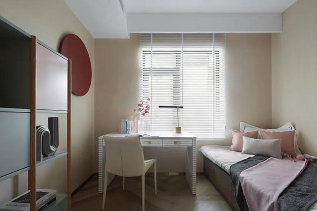 公主房米灰搭配的主題顏色,搭配上粉色的點綴,滿足每個女孩的公主夢,從墻面到配飾,還有側面的儲物柜,無不體現(xiàn)粉色的夢幻與溫馨。